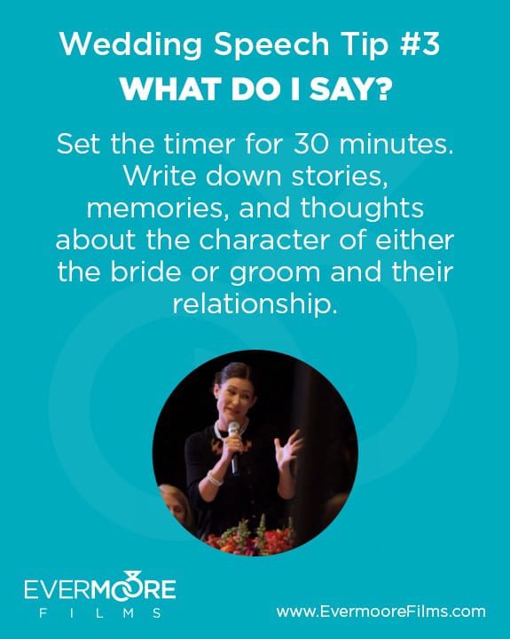 Prepare for your wedding toast by setting a timer for 30 minutes. Ignore your to-do list and the neighbor’s dog and concentrate. Think back to the time you first met or your first memories of either the bride or groom or both. It’s always fun to hear stories from way back by the siblings and parents, but spilling each others’ lunch trays in the caf is a great story too. Write down old memories and most recent experience in the past few months as you’ve interacted with the lovebirds. Think and speak only on things that are true, honorable, pure, lovely, and worthy of remembering so that you can make their special day a happy one to remember…not just at the wedding but for years to come as they watch re-runs of their wedding video with their kids!