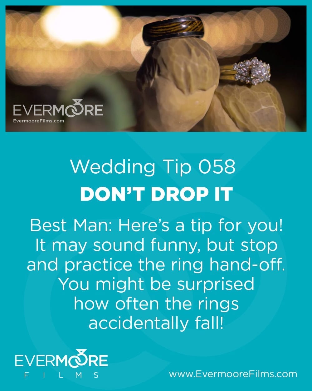 So many things to plan a wedding, and yet details play a big roll Like those two little bands the bride and groom wear as a symbol of their never ending love? Best man, this tip is for you. Practice the “ring hand off” to the officiant so that you don’t drop them! Believe us, we’ve seen it more than once! By the time you get on stage you’ll be all nerves and excitement, so practice the “hand off” as one less thing to worry about. Watch Josh and Erin’s wedding highlight film for a glimpse of their beautiful rings that never touched the floor!